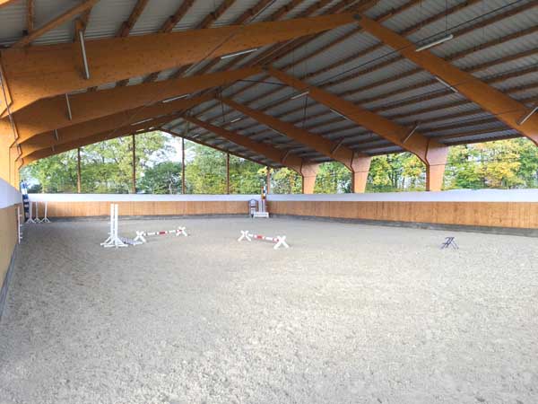 Aussenreitplatz und hauseigene Reitwege. Auf grossen, mit Holz