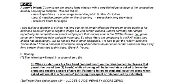 den übermäßigen Missbrauch von NRHA-Klassen zu Schulunsgzwecken und schlägt vor, Reiter, die die zweite, freie Hand benutzen, direkt mit einem 0-Score zu belegen und unverzüglich zum Verlassen der Arena aufzufordern.