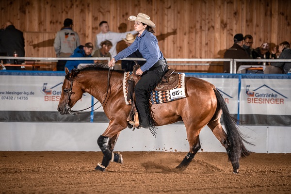 In der anschließenden Klasse, der Novice Horse Open, waren dann die Profi-Reiter an der Reihe ihren Showneulingen das Turnierleben näher zu bringen. Mit 21 startenden Pferd-Reiter-Kombinationen war auch diese Klasse gut besucht. Den Sieg in der nationalen Klasse teilte sich Mona Dörr auf G WHIZ GUS mit Grischa Ludwig und CHESTERNIC. Beiden Profis gelang mit ihren Pferden ein toller Score von 142. Platz drei ging wiederum an Mona Dörr, die auch mit SMOKING VOODOO spannenden Reining-Sport zeigte und mit einem Punkt weniger, einen Score von 141 und damit den Bronzerang, erlangte. Die Platzierung in der Novice Horse Open USA wäre identisch, doch Mona Dörr nannte diese Klasse nicht. So siegte Grischa Ludwig, dieses Mal alleine, auch in der Novice Horse Open mit einem Score von 142. Platz zwei teilten sich drei Reiter mit vier Pferden. Allen vier Duos gelang ein Score von 139,5. Silber ging an: Simon Bilger mit WIMPY CRASHED ICE, Julia Städele mit SWEET BIG GUN und Johannes Heil, der gleich mit zwei Pferden aufs Treppchen ritt, mit SL CHIC DEL CIELO und CDC RUF IN CROME